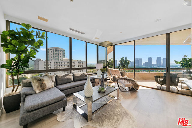 Boasting over 2800 square feet and positioned for the best views in the city, this most sought-after floor plan in the Mirabella is stunning. New hardwood floors and fresh paint provide a bonus wow factor. 270-degree views of the entire Los Angeles basin including the ocean, Playa del Rey, Century City, DTLA, and the Hills of Beverly can be enjoyed from the unique property. A large entry hall leads to a light-filled living room with fireplace and wet bar. Two large en-suite bedrooms on opposite sides of the unit create the ideal layout. The primary bedroom features a double door entrance, two walk-in closets, a grand bath suite with separate shower, jetted tub, and water closet complete with bidet. Watch the sunrise in the morning, then the sparkling city lights at night from the welcoming outdoor terrace. A den, guest bathroom, and laundry room complete this sanctuary in the sky. Your side-by-side parking spaces have their own personal EV charging. Mirabella is a five-star, full service, luxury high-rise. Amenities include 24-hour security, valet, concierge, gym, pool, spa, conference room, on-site management & maintenance, deeded storage & parking, community EV charging, even temperature-controlled wine storage. All this just minutes from world class dining, shops, entertainment and medical in Beverly Hills, Century City, Westwood and UCLA.