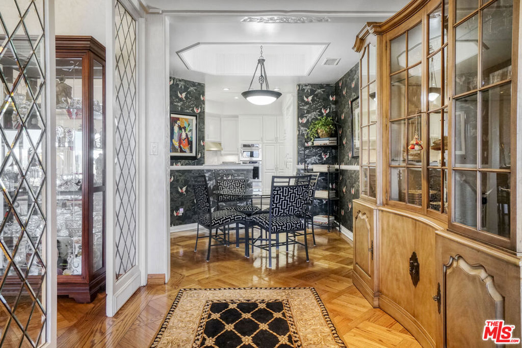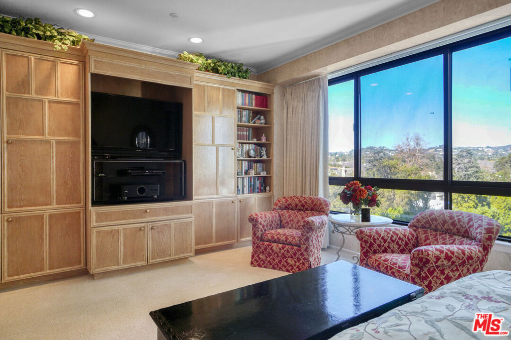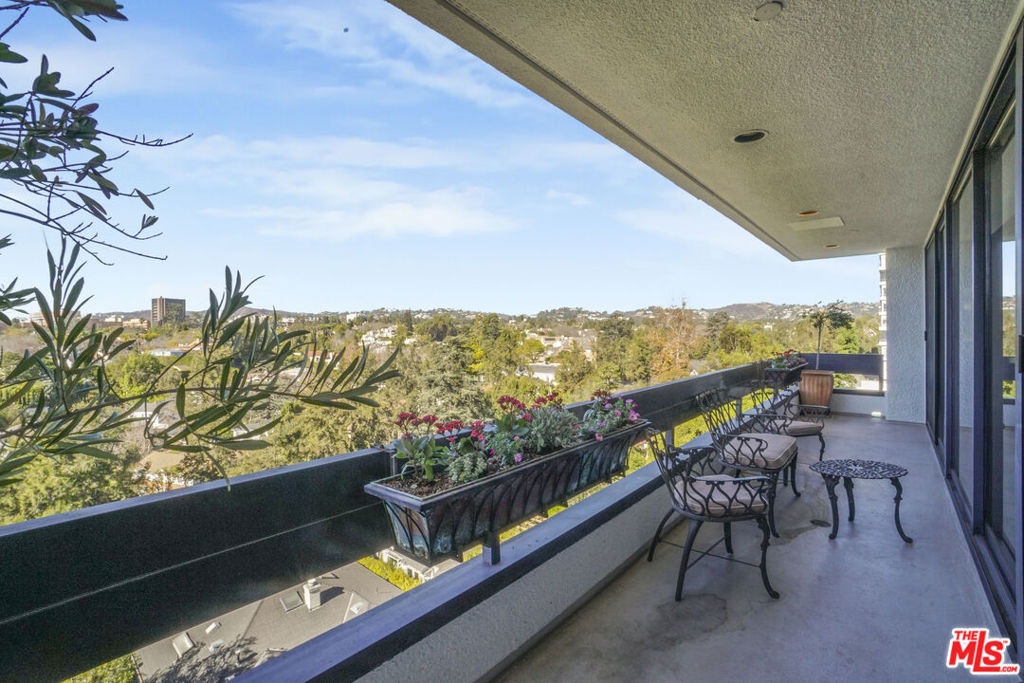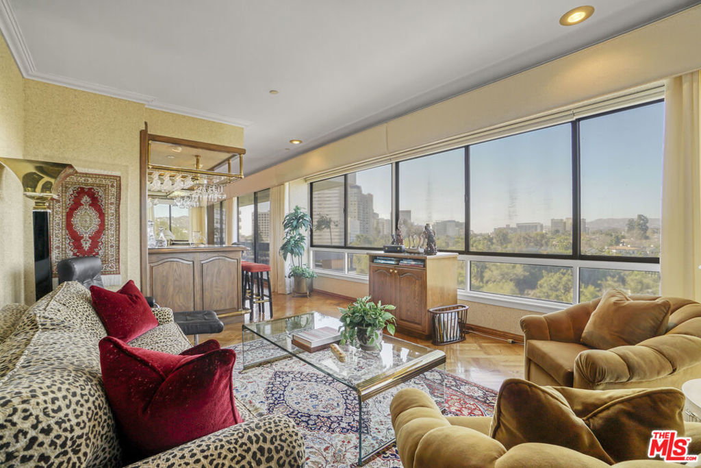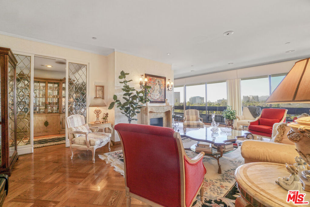Enter this warm and welcoming corner unit streaming with natural light. Gracious Living Room with fireplace and Formal Dining room open to a generous balcony, Den with wet bar complete the entertaining areas all with oak parquet wood flooring. Sweeping northerly views of Westwood Hills, Bel Air and the Getty. Newly remolded Kitchen features Convection/Microwave oven, Viking induction cook top, dishwasher and brand-new Fisher&Paykel built in Refrigerator/Freezer. Separate laundry room with service entrance. In addition, there is a lovely Breakfast room. Spacious Primary Bedroom with newly remolded Bath, includes double vanity with backlit Cristalo Marble. Marble countertops and under cabinet automatic lighting. Separate Shower and soaking tub. Second Bedroom suite, includes built in cabinets and desk. Motorized shades are in Dining Room, Living Room, Den, and Primary Bedroom. Separate storage locker, Side by side parking. Furniture can be sold separately. HOA Dues include: Water 24 Hour Concierge, Valet, Pool, Sauna, Gym, Recreation Room, and Basic cable. Trust Sale no court conformation. 24 Hour notice to show Text Agent.