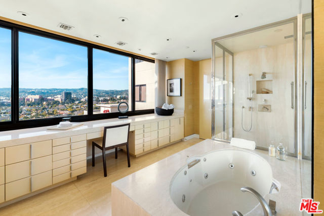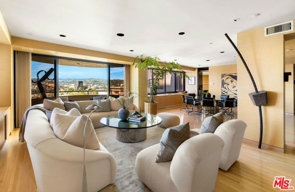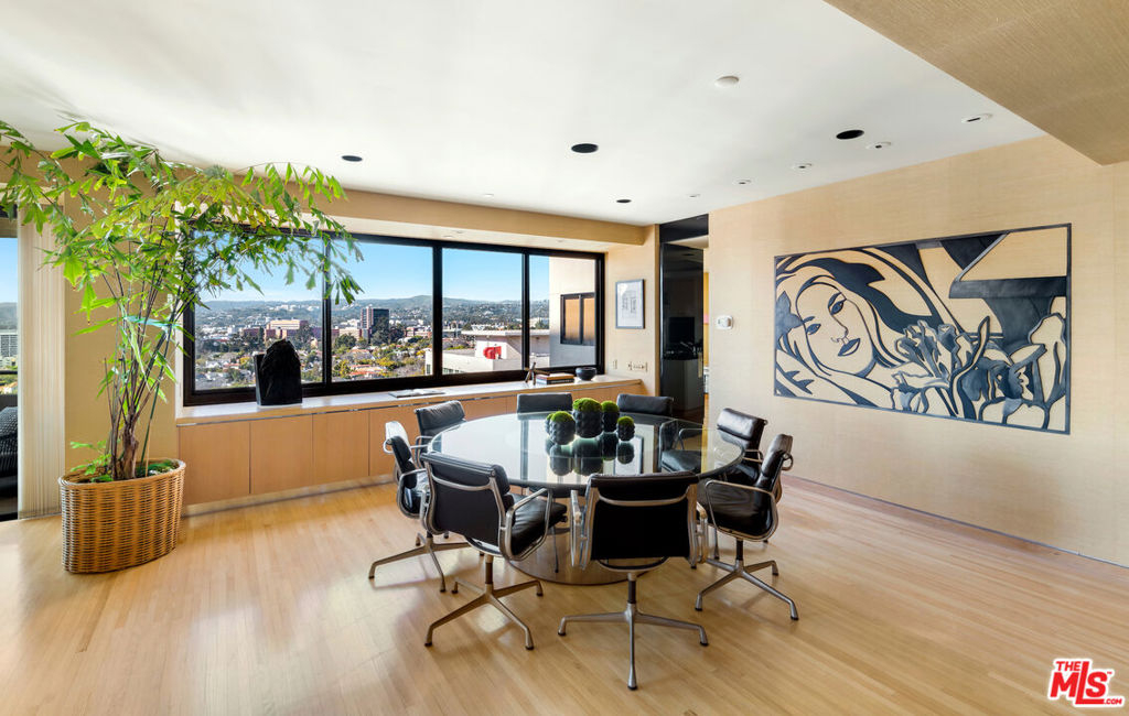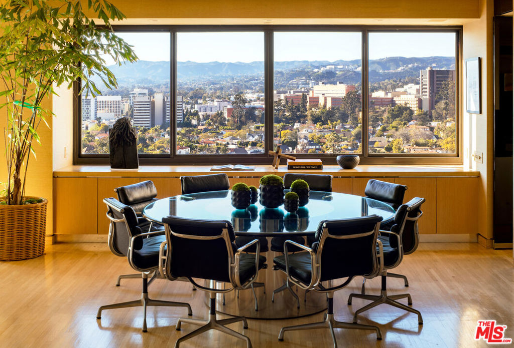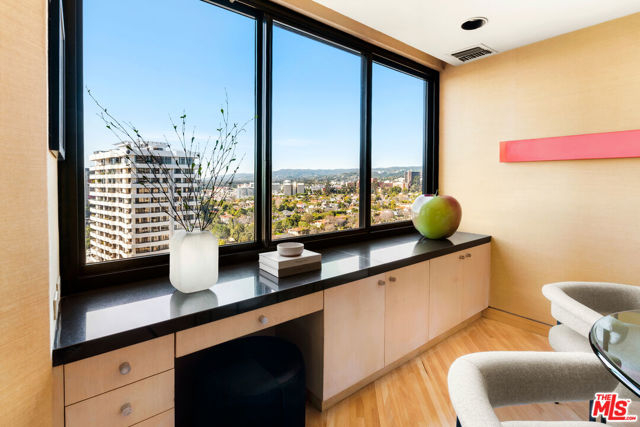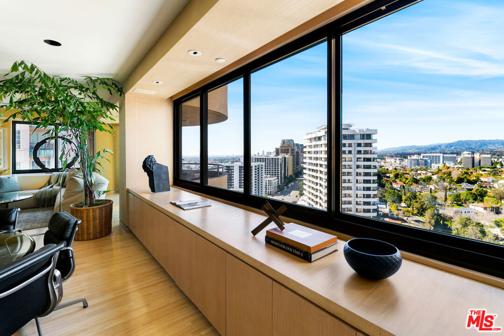 Absolutely sensational Sally Sirkin designed North/West corner suite occupying the 18th and 19th floors of the prestigious TEN-FIVE-SIXTY building on the Wilshire Corridor, where residents enjoy 24-hour valet and concierge services, gorgeous remodeled common areas including a spacious lobby, large social room with caterer's kitchen, fitness studio, pool and patios, and easy ingress and egress via Thayer Avenue. Enter suite 1803 to meet expansive views and exquisite design details throughout, including high gloss lacquer ebony interior doors, sea grass wall coverings, hardwood flooring and the finest carpentry displayed in vast built-ins throughout. The open floor plan reveals an architecturally inspiring floating stairwell, two seating areas, a dining area and outdoor terrace. The center island kitchen boasts granite counter-tops, wood cabinetry, stainless appliances, a spacious dining area and a butler's pantry with a laundry area. Also on the main floor is a sophisticatedly dressed powder-room for the service of guests. Upstairs find that highly coveted primary suite with outdoor terrace, custom office and media center, and dual bathrooms, each offering a large walk-in closet. The second en-suite bedroom is generous in size, and offers built-in cabinetry and a desk looking outward to the breathtaking view. There is elevator access to the second floor.