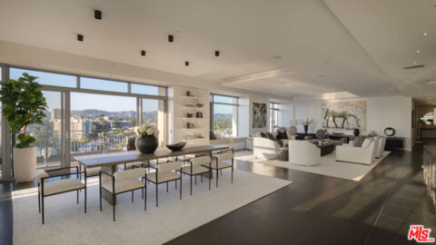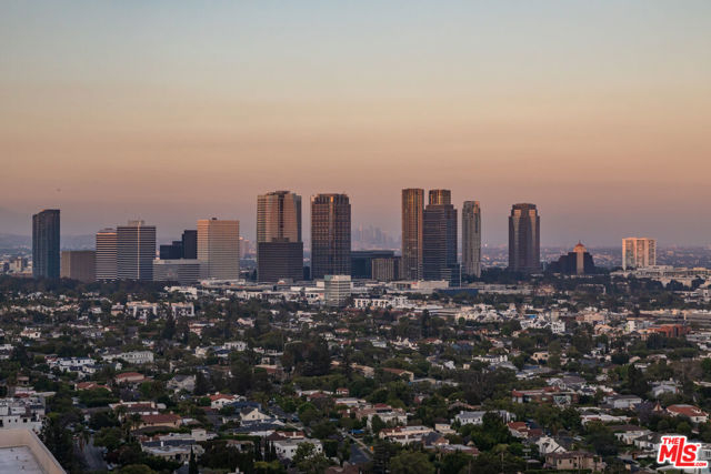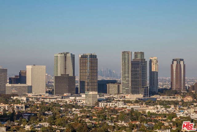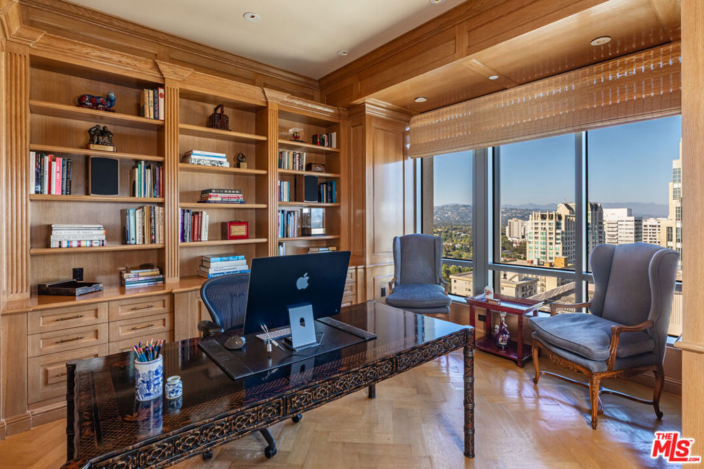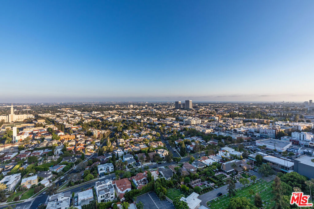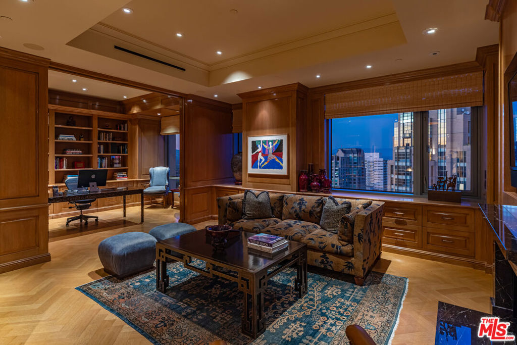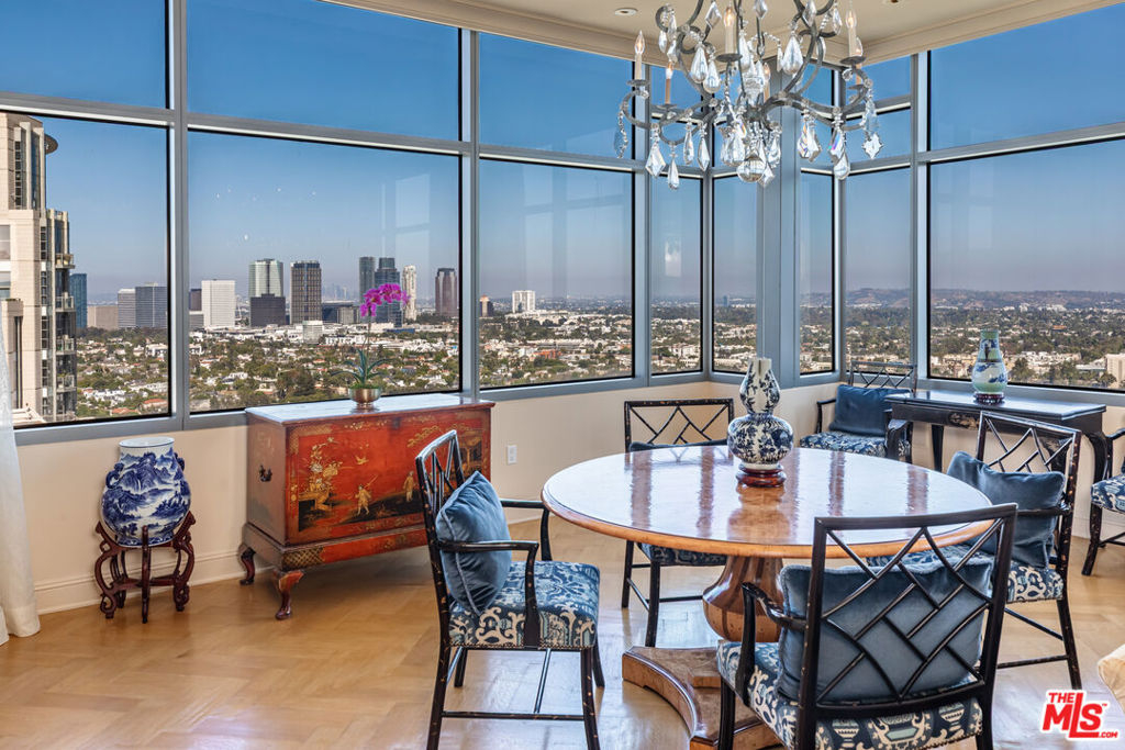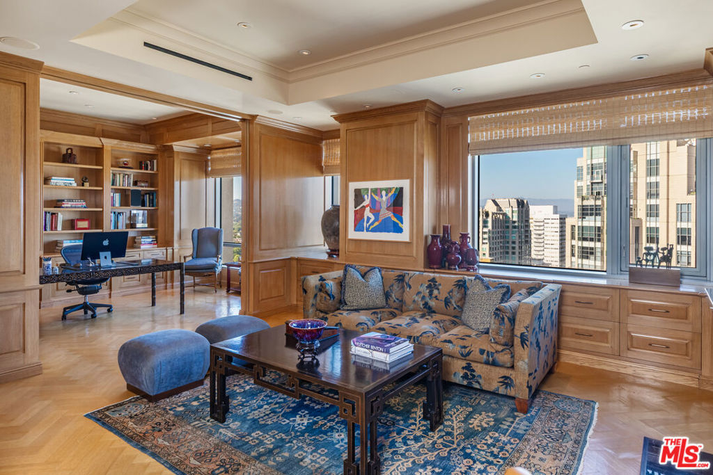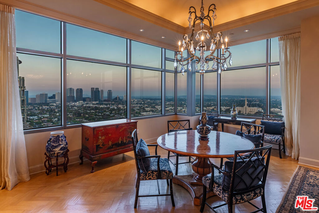 Along the famed Wilshire Corridor, this 5,056sf penthouse in the sky offers 2 bedrooms, 3 bathrooms, 2 powder rooms and a separate 568sf private housekeeper's unit. A dedicated elevator opens into a sophisticated foyer that immediately reveals sweeping vistas from Century City and downtown to the hills, marina, and the Pacific beyond, stretching out in every direction through expansive windows. The open floor plan features a grand formal living room with twelve-foot soaring ceilings, soft cove lighting and a built-in bar that creates a refined setting for entertaining. Every room is thoughtfully positioned to capture the sweeping 180-degree views. The formal dining room boasts twelve-foot ceilings, a dramatic oval recessed cove and cobalt Viennese plaster walls. Designed for elegant gatherings, it comfortably seats ten and opens to a private terrace. The gourmet kitchen features a bold blue granite island, top-tier appliances, a breakfast area, built-in desk, wine fridge and a butler's pantry. A distinguished den features rich wood-paneled walls, custom built-in cabinetry and shelving and a black marble fireplace. An adjoining office completes the space. Double doors open into the sumptuous primary suite, where serene panoramic views envelop the space, along with a cozy fireplace, inviting sitting area and private terrace. The suite boasts dual luxurious bathrooms, each with spacious walk-in closets and custom countertops, one featuring an Azul Cielo stone soaking tub overlooking the city, and the other adorned with rich wood finishes. A sophisticated guest bedroom suite completes this private wing. Additional luxurious highlights include dual private elevators, Herringbone oak floors run throughout, ample storage, motorized blackout shades and a state-of-the-art Lutron system. A separate, private corner housekeeper's suite offers a full bath, sleeping area, kitchenette and dual exposures with windows on two walls, providing both comfort and natural light. The Californian's luxurious full-service amenities include 24/7 security and valet, on-site manager, ample storage, a state-of-the-art fitness center, temperature-controlled wine cellar, and a heated pool and spa nestled within landscaped gardens. A rare offering in one of L.A.'s most prestigious buildings, this penthouse blends sweeping city-to-ocean views with timeless design and effortless luxury. Both expansive and intimate, it's a serene sanctuary for those who value beauty, privacy, and the art of elevated living above the city.