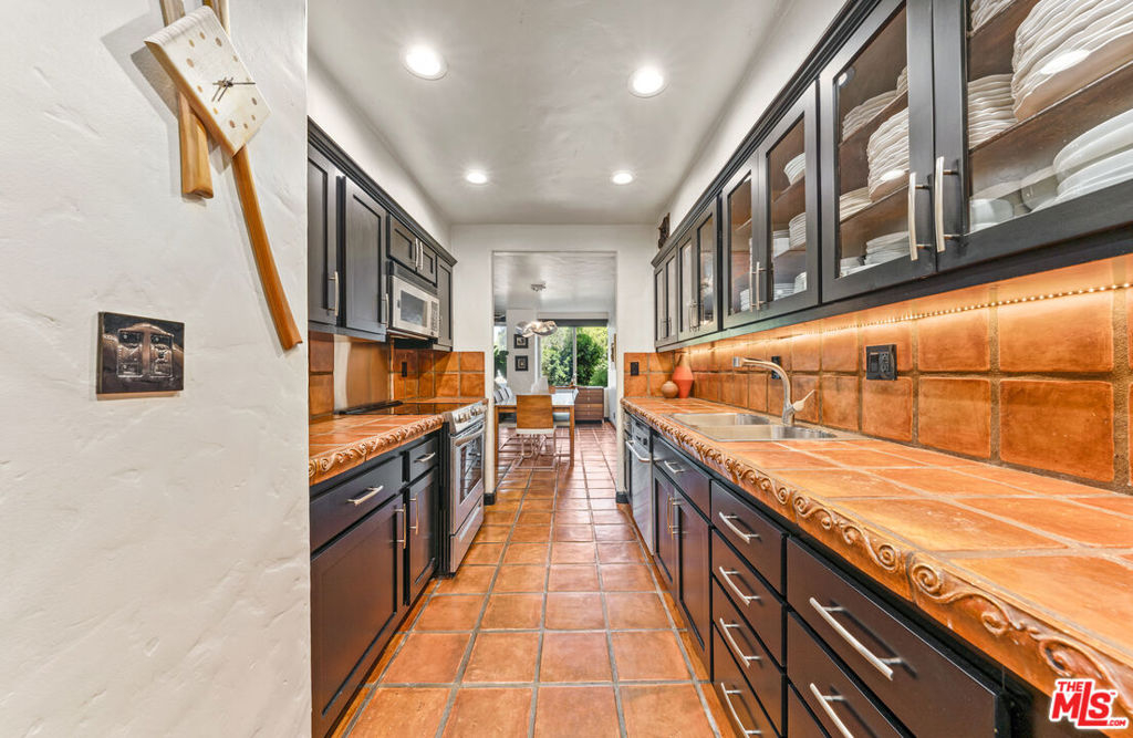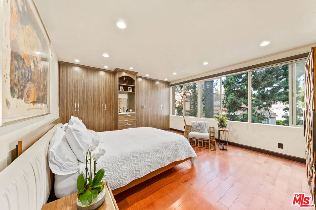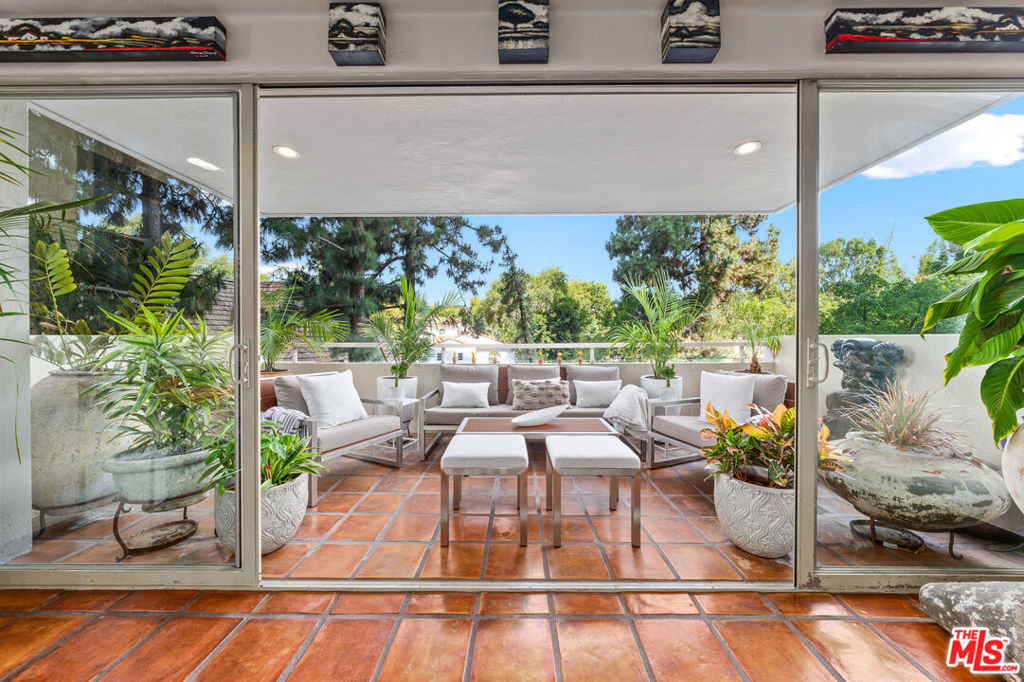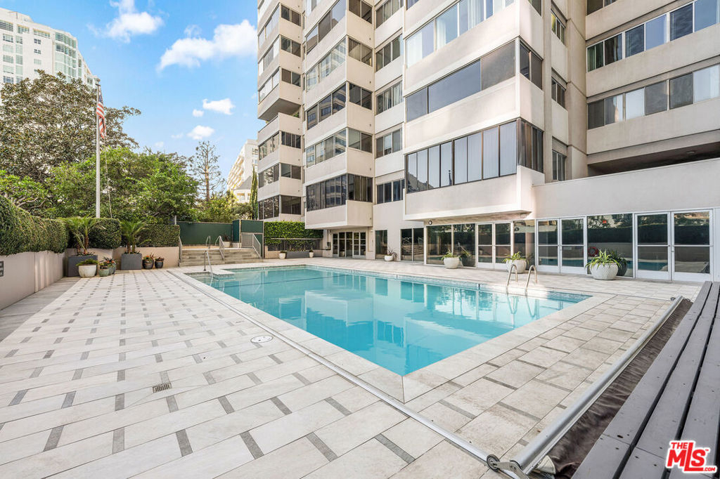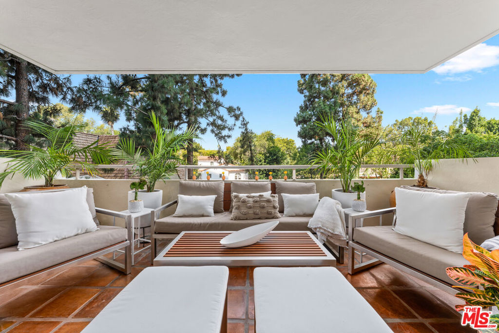 Resort-like quality and warm ambiance in this REAR facing unit with its eclectic juxtaposition of rustic and modern touches, providing wonderful privacy, rich terracotta tile, and quiet green/tree views throughout. Enter this oversized 1 bedroom, 1 bathroom residence and be enchanted: from the large formal entry with bar and storage, to the enormous open plan living room and dining area, to the gourmet kitchen with custom cabinetry, tile, and tons of storage and counter space. All of this opening to a versatile entertainment space: a generous leafy terrace providing exceptional outdoor living including built-in heaters and lounge space large enough for numerous guests to dine, read or relax. Also features a lovely bath with rich, bespoke finishes and a secluded bedroom with double walls of custom closets. Approximately 1,343 sq.ft. in the full-service Comstock building featuring 24/7 valet parking and security, pool, spa, sauna, fitness center and recreation room. Easy access - entrance on Comstock Ave with luxe motor court, lovely grounds with a true resort feel. Located two short blocks to Holmby Park. HOA dues are $1,353.66/mth and includes: central heat/air, hot/cold water, internet, onsite management and cable TV. A rare opportunity to have the comfort of a single-family residence with the convenience of a luxury condominium building.