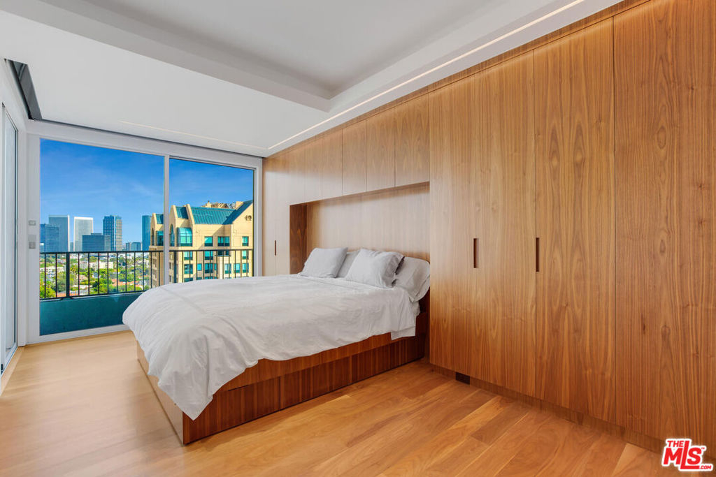 Perfect Pied-a-terre/home away from home or a luxury hotel alternative! Multi year remodel has created one of the most fabulous one bd/two bath condos imaginable on the Wilshire Corridor. This one has it all: 4" wide plank oak floors, 9' architectural ceilings, automatic electric disappearing shades and special insulation in walls for sound proofing. The entire condo has indirect fiber optic changeable colored lighting, built in bluetooth sound system with in-ceiling speakers, and wired for Home Theater 50" TV complete with built in speakers and subwoofer. Top of the line Fleetwood windows and doors open to a wonderful patio with gorgeous slate floors, overlooking the view to Century City and downtown. Kitchen has Sub Zero refrigerator & freezer drawers, Miele induction cook top & microwave, electrified lacquered kitchen cabinets and lacquered finished bar top. Separate area has dining nook, gorgeous custom built ins with magnificent wood and a Sub Zero 2 zone wine cooler and bar area. Wenge wood & frosted glass dramatic double doors separate the Master Suite. Bedroom has built in cabinets and an abundance of storage areas. Spectacular master bathroom has huge slate shower, double shower heads, built in bench and slit drain. Built in safe masterfully concealed, and riglet finished dry-wall throughout to create the illusion of floating walls. All of this with magical views and dramatic sunsets. Full service building with all of the extras - including guest rooms.