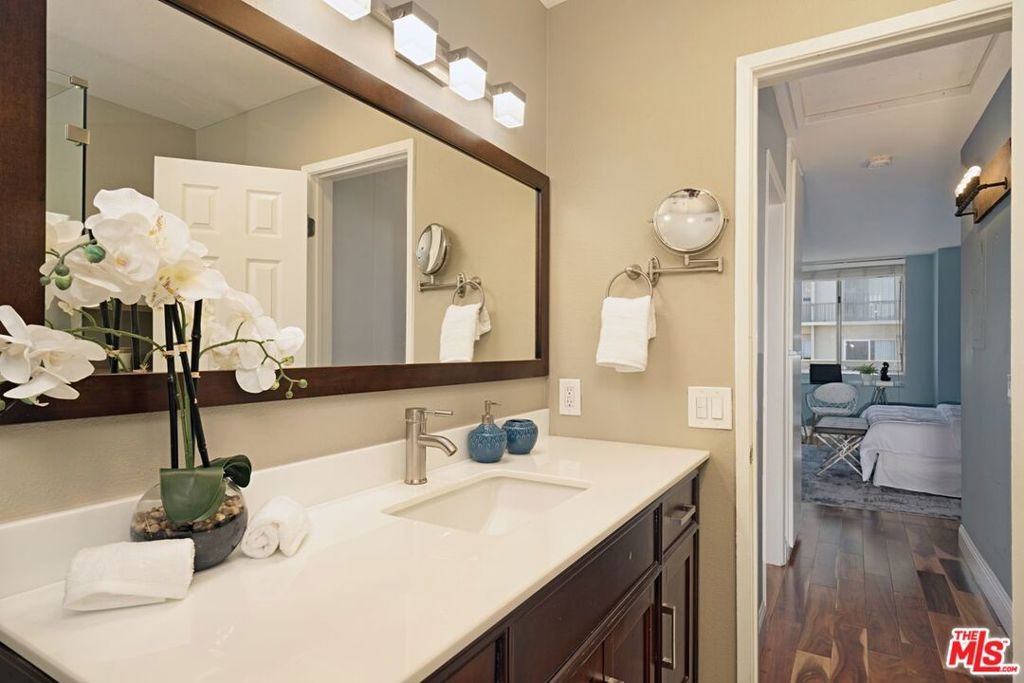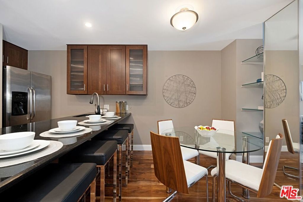 High atop the Wilshire Corridor sits this tastefully remodeled 1 bedroom / 1.5 bathroom Penthouse in the boutique hotel style high rise, Wilshire Selby West. The wide open floorplan inspires casual living and spontaneous entertaining. Cook gourmet meals or share stories standing around the gorgeous open style kitchen with breakfast bar seating, granite counters, newer cabinetry & stainless steel appliances. Just off the kitchen and entry is the stylish guest powder room with extra storage. Flow effortlessly from kitchen to dining area, through the living room and out to your own balcony. Start your mornings sipping your favorite cappuccino and soaking in the breathtaking sunrise views of the city and lush green mountains of Bel Air. Sleep peacefully in the primary suite or get some work done in the separate workspace. The recently remodeled primary bathroom features a large shower with bench seating & lots of counter space. Control the central air/heat with your phone via the Nest App