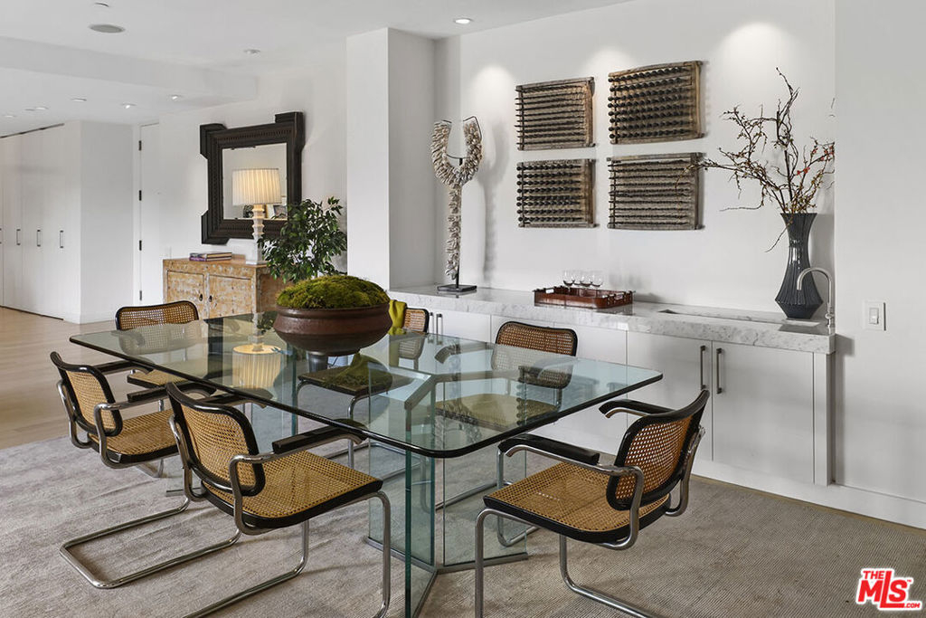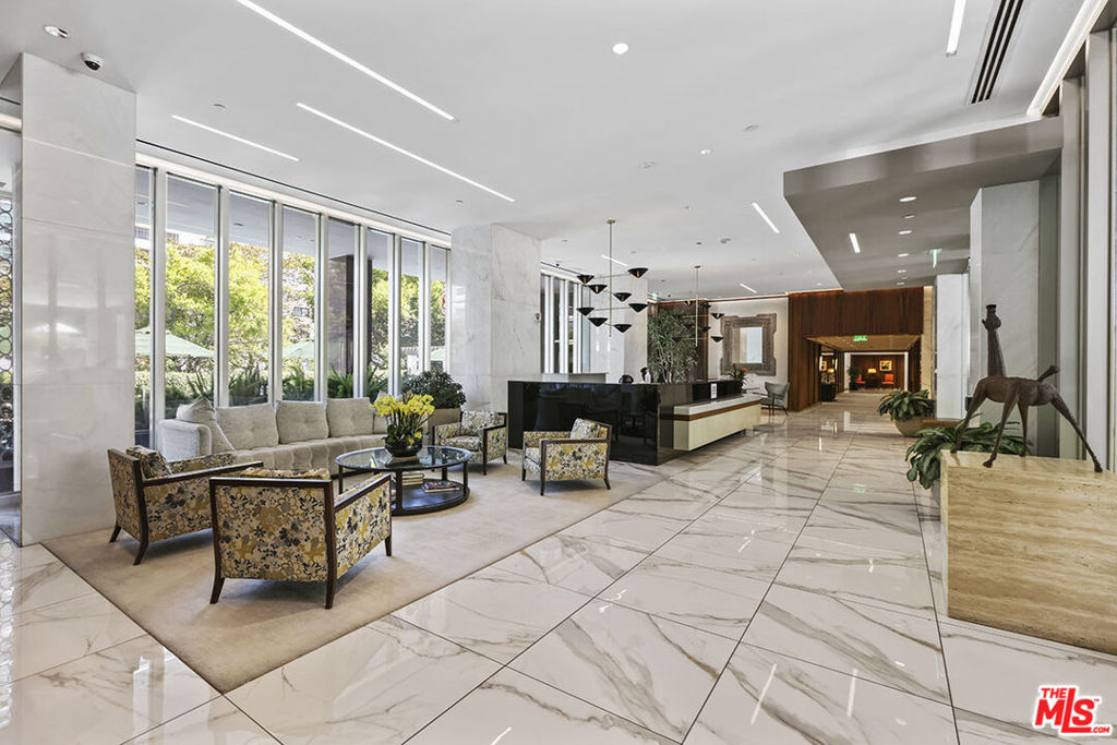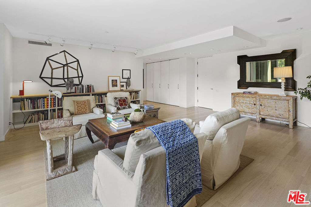 An exceptionally light, bright and airy unit in the incomparable Wilshire Terrace co-op. This approx. 2,000-square-foot unit is ideally located on the north side, overlooking peaceful gardens, fountain, and landscaped grounds.The open-plan 2 bedroom, 2.5 bath unit has been renovated with plank hardwood floors, distinctive light fixtures. Large walls suited for art with an open flow from living area, dining area, and media room/den with gas fireplace. Sliding Fleetwood doors lead to central two-story patio from living room, den and office, all part of the building's distinctive design that offers ample space for outdoor entertaining. The second bedroom has been opened to the primary suite, creating an adjacent office/ sitting room closed off with pocket doors. Can easily be converted back to a separate bedroom. Fitted Siematic kitchen is equipped with Sub-Zero fridge and Miele ovens. Separate laundry room with half bath. The sale of the property includes unit 2C and the housekeeper's unit MR115. Units are to be sold together, both in "As-Is" condition. Some furniture may be included in the sale.