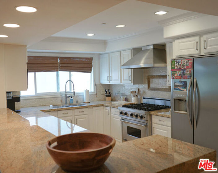 Ultra private top-floor corner residence on the prestigious Beverly Glen Blvd in Century City, offering over 1,600 sq ft of light-filled living. This beautifully maintained 2BD/3BA condo features two private balconies, a double-door entry, hardwood floors, and an open layout with a bright kitchen appointed with white cabinetry, granite countertops, and premium appliances. Spacious primary suite with walk-in closet, and double sink bathroom. Second bedroom has its own bathroom with hallway separation. Guest powder room located in the unit entryway. Turnkey condition with in-unit laundry (new 2025 washer/dryer), central HVAC with Wi-Fi thermostat, and quality finishes throughout. Secure, elevator-served building with intercom entry, community room, and low HOA dues. The building is equipped with fire sprinklers, two fire escape stairwells, and carries both earthquake and fire insurance. Includes 2 garage spaces + guest parking. Prime location just minutes to UCLA and Westfield Century City mall.