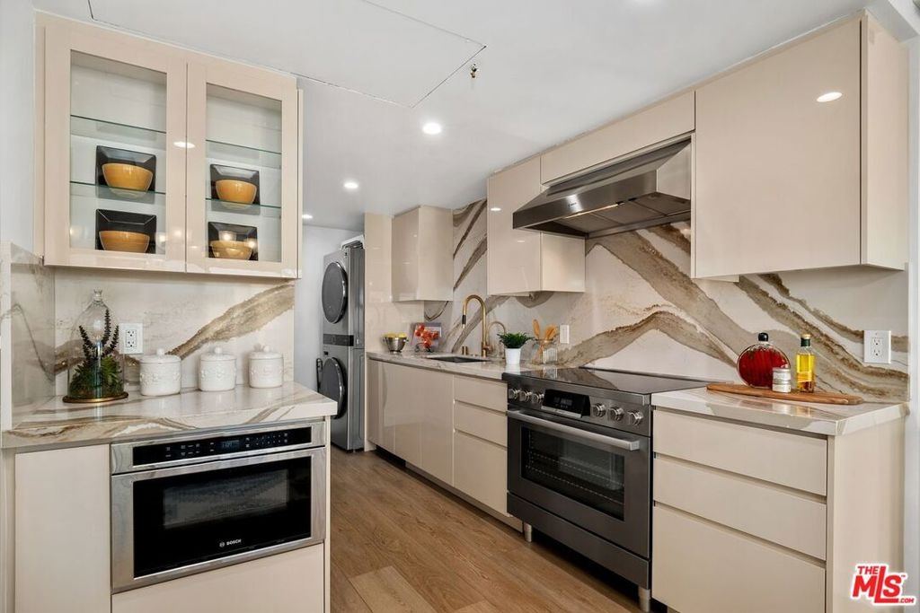 Welcome to this stunning 1 bedroom, 1 bath condo, located on the 5th floor of The Churchill, a full-service building on the prestigious Wilshire Corridor. This front-facing unit boasts an open floor plan, perfect for entertaining guests. The newly remodeled, state-of-the-art kitchen is a chef's dream, equipped with elegant quartz countertops and backsplash, a Bosch induction range, a Bosch built-in microwave, a Miele dishwasher, a spacious pantry, and an LG refrigerator and washer/dryer. A matching built-in buffet with lots of storage extends into the dining room. The living room is equipped with Shade Store roller blackouts, providing style, privacy and comfort. The bedroom offers Hunter Douglas Pirouettes partial blackout shades and a walk-in closet, a unique and rare feature at The Churchill. The remodeled bathroom includes a large soaking tub and a high-end Toto wash-let toilet. Relax on the large balcony and enjoy the convenience of 2 large storage units in the garage. Residents of this full service building enjoy fabulous amenities, including 24/7 valet and concierge services, a pool, a card/rec room, and a gym. HOA dues conveniently cover all utilities and basic cable. Perfectly situated near Westwood, Beverly Hills, and Century City, this condo offers convenience and luxury in one of LA's most desirable areas. Don't miss the opportunity to make this exquisite condo your home!