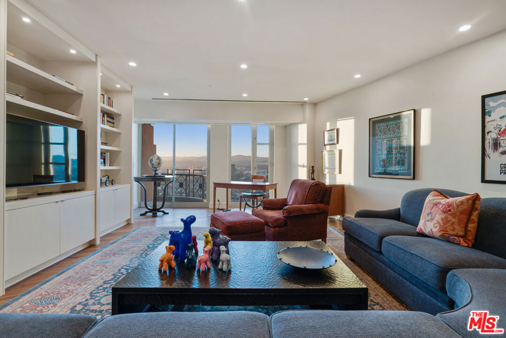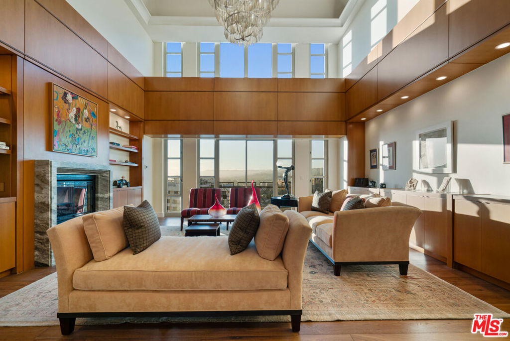Luxurious "Junior Penthouse" on 23rd floor at The Wilshire on prestigious Wilshire Corridor. Mesmerizing city, mountain, and ocean views from 4 terraces facing N, E, and S. Beautifully updated and decorated; move-in-condition! Elevator opens onto private vestibule. Elegant gallery spans entire width of unit. Soaring, light-filled, 2-story living room w/FP, custom built-ins + generous terrace facing N. Spacious family room w/custom built-ins + terrace facing N, bathroom, + adjacent storage room w/service hall access. Powder room and sitting alcove adjacent to formal dining room + terrace facing N with stellar views. Completely updated chef's kitchen features top-of-the-line appliances, cabinetry, tiles, and counter tops. Separate laundry room. Primary suite frames enviable eastern and southern views from generous bedroom + terrace, luxurious bathroom + walk-in closet. Suite also incorporates sitting room + terrace, walk-in closet + bathroom (formerly a third bedroom). Spectacular wood floors, cabinetry, sophisticated finishes and customized closets throughout. Electronic and manual window coverings. The Wilshire is an amenity-rich, full-service building with a superb, long-term staff. Gym, swimming pool, elegant party room, card room, business center, catering kitchen, gym, wine storage locker, two parking spaces, and private storage room in garage. Note: Originally 3 bedrooms, unit was expertly converted to a primary ensuite w/sitting room, plus a family room. Could be converted back to 3 ensuites.