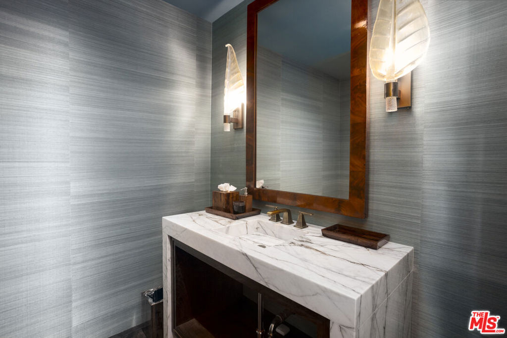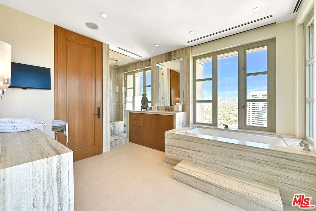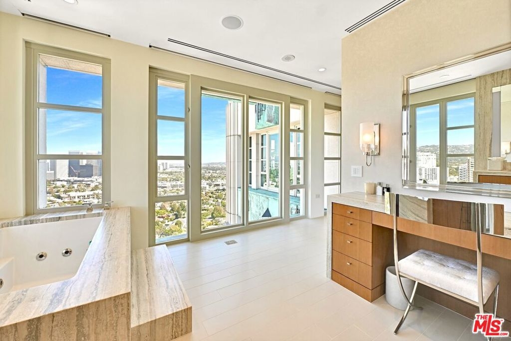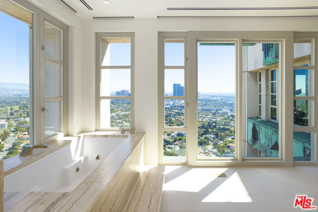 A Concierge controlled elevator whisks you up high above the bustling Boulevard to your peaceful two-story sanctuary in the sky. Comprised of the top two floors of the building, it's a true Penthouse. Greeted by its sweeping staircase, this truly feels like a home that's perched high in the clouds. There is an additional internal elevator between the first and second floor of this penthouse which makes bringing all those designer packages up to the bedrooms an effortless process. Extensively remodeled by the current owner and offered fully furnished by nationally acclaimed designer Madeline Stuart, this is the epitome of luxurious living! Beautiful custom wood panels, lustered wood cabinetry, luxurious wide plank wood floors and coffered wood ceilings bring a sense of warmth and richness to the entire Presidential Penthouse. All this while there are staggering uninterrupted views out of each and every window. There is one bedroom suite on the first floor and two bedroom suites on the second floor. There is also an additional room on the second floor that has an en-suite bathroom with shower that works perfectly as a gym/massage room or office. The den/bar area with its temperature controlled wine wall and wet bar flows into the Living Room with its beautiful ceilings and fireplace. Dining Room opens to private rooftop terrace with built in barbecue and astonishing views of the building elements that are lit at night and all of this with a backdrop of city lights. The kitchen is sleek and beautiful. Storage everywhere and lots of counter space with a fun breakfast area and a built in work area for the day help. Large laundry room outfitted completely with a separate entrance for the daily help. Then, you ascend the sweeping, sleek, steel balustrade staircase that is a work of art in itself. Two story art walls line the stairway up to the second floor. When you walk into the second floor Master Suite, the best way to describe it is like biting into a cream puff. Upon entering through the double doors to the Master Suite you feel immediately enveloped by a warm and soothing elegance with those mesmerizing views from the floor to ceiling glass walls and windows. Her bath and separate walk in closet is elegantly appointed with a dressing area and beautiful sheets of pale white stone. His bath and custom fitted closet are equally as appointed in similar stone with a large steam shower. One bedroom suite is customized as an office, befitting a CEO, with it's own jaw-dropping view, bathroom, and large walk in closet. The fourth bedroom suite can be used as an in-house gym or fourth en-suite bedroom. This is a trophy property and by far The best Penthouse in town. This prestigious property offers a wealth of amenities, including full concierge services, 24/7 valet parking, an on-site building manager, a banquet room with a fully equipped catering kitchen, a conference room, a fitness center, a pool, and secure parking for up to 3 cars. Welcome to "The Wilshire".