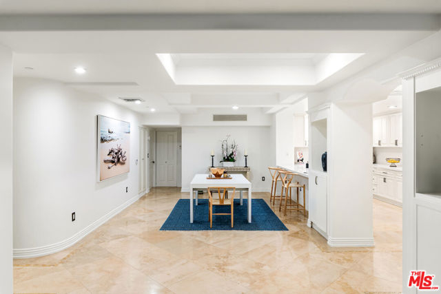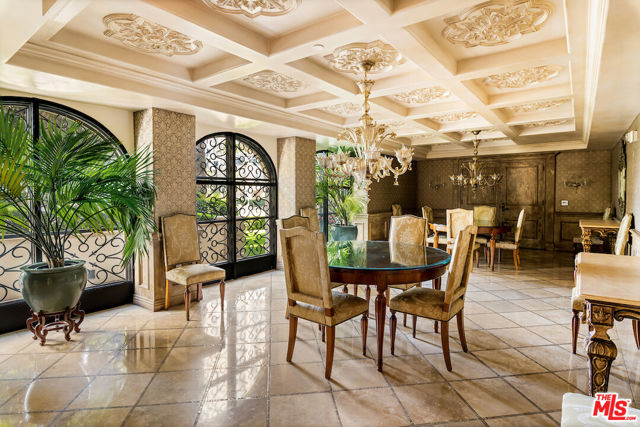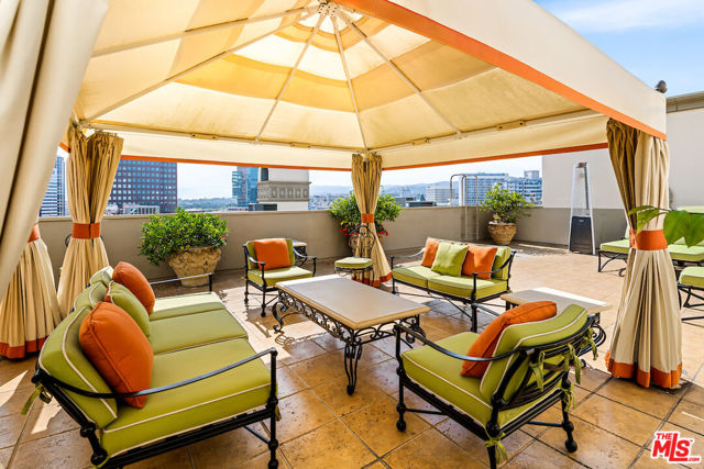 Welcome to The Venezia, a prestigious boutique full-service building on the Wilshire Corridor. Elegant coffered ceilings and pristine stone floors welcome guests into the open concept floor plan. The expansive living room harmoniously flows through grand arched doorways to the private outdoor patio framed by lush greenery, offering a tropical retreat and welcoming in an abundance of natural sunlight. The chef's kitchen is fully equipped with new Thermador appliances, generous Caesarstone quartz countertops and a breakfast bar in addition to the adjacent dining area. The primary suite, adorned with rich hardwood floors, offers dual closets and a luxurious en suite with spa tub. A secondary bedroom, with its own en suite, a powder room, and laundry area complete this highly functional layout. A seldom available opportunity to reside in The Venezia and enjoy 24-hour concierge service, a state-of-the-art fitness center, and a swanky rooftop with outdoor kitchen and sweeping panoramic views. Walking distance to Westwood Village and UCLA. Just minutes from renowned Beverly Hills dining and entertainment.