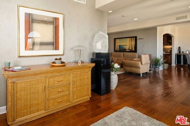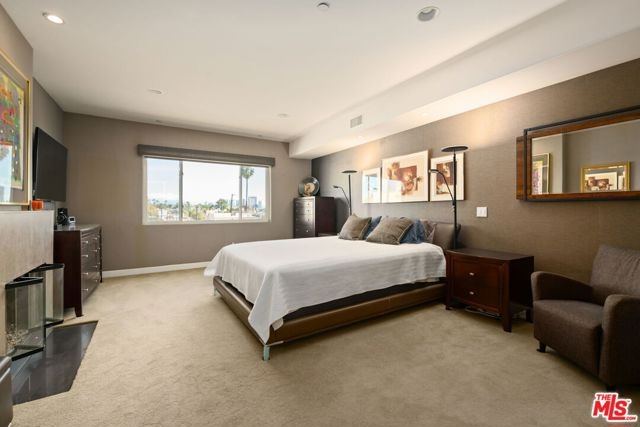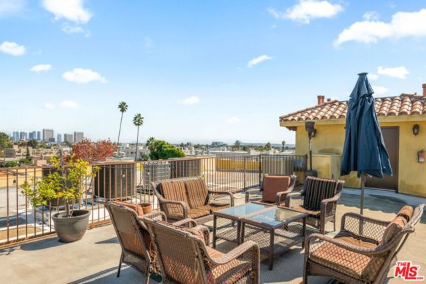 This exquisitely remodeled corner penthouse in a newer Mediterranean style building offers an unparalleled blend of refined elegance, comfort and sophistication, as well as gorgeous northeast facing views of city and skyline. This "developer's unit" boasts 3 bedrooms or 2 plus a den and 2.5 baths in approximately 1850 square feet all on one level. A gracious double door entry and expansive Anderson windows welcome you into an open and airy living space where high ceilings and rich wood floors create a peaceful, inviting ambience. A chic "designer perfect" powder room is tucked off the entry. Designed with both style and function in mind, the gourmet kitchen features top of the line Viking appliances and a Sub-zero fridge, Caesarstone countertops and custom cabinetry. The living and dining areas, enhanced by a custom designed stone fireplacethat adds warmth and character flow to a large front balcony. The serene primary suite offers a fireplace, luxe bath and generously sized walk-in closet. A spa like guest suite completes this wing of the unit. A spacious private rooftop deck with BBQ area offers breathtaking views, providing the perfect backdrop for entertaining or quiet relaxation. No expense was spared on the quality updates and finishes throughout which include imported wall coverings and Porcelanosa Spanish tile. Other highlights include recessed lighting, ample storage inside and out, secured side by side parking, plus guest parking, and low HOA dues. Ideally situated adjacent to Brentwood, Santa Monica and Westwood, this rare and special residence is truly a gem!