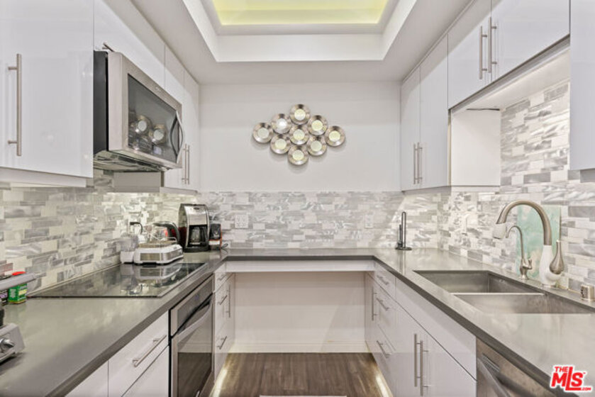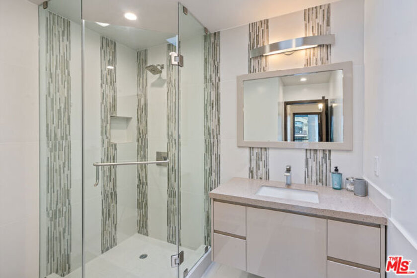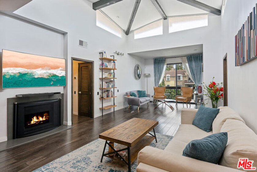 Stunning single level penthouse, where cathedral ceilings with 360 degree windows flood the living room with natural light. Remodeled throughout, this home blends style and comfort with an open-concept design perfect for both relaxing and entertaining. The kitchen features sleek stainless steel appliances, contemporary countertops, a spacious breakfast bar, and ample cabinetry. The primary suite offers a serene retreat with a large floor to ceiling window, a generous walk-in closet, and a spa-inspired en suite bathroom complete with a soaking tub, separate glass-enclosed shower, and dual vanities. Additional highlights include in-unit laundry, two-car parking with an EV charger, and access to the community pool. Perfectly situated near shopping, dining, and entertainment.