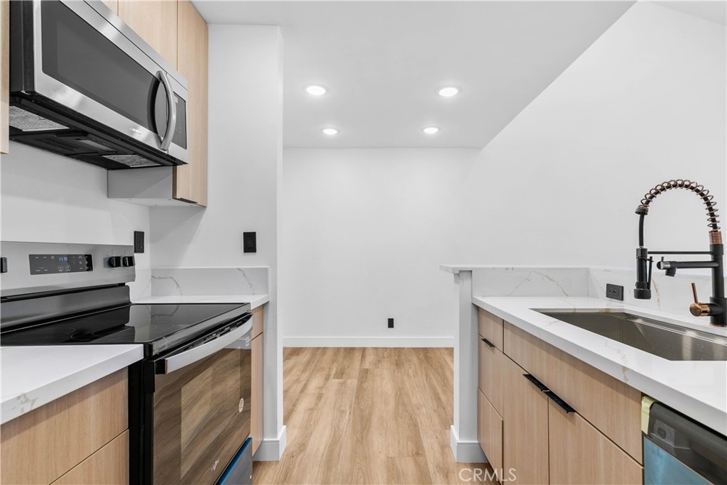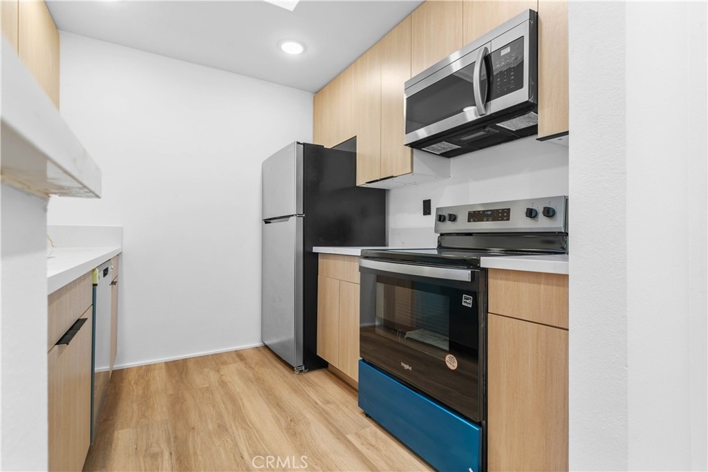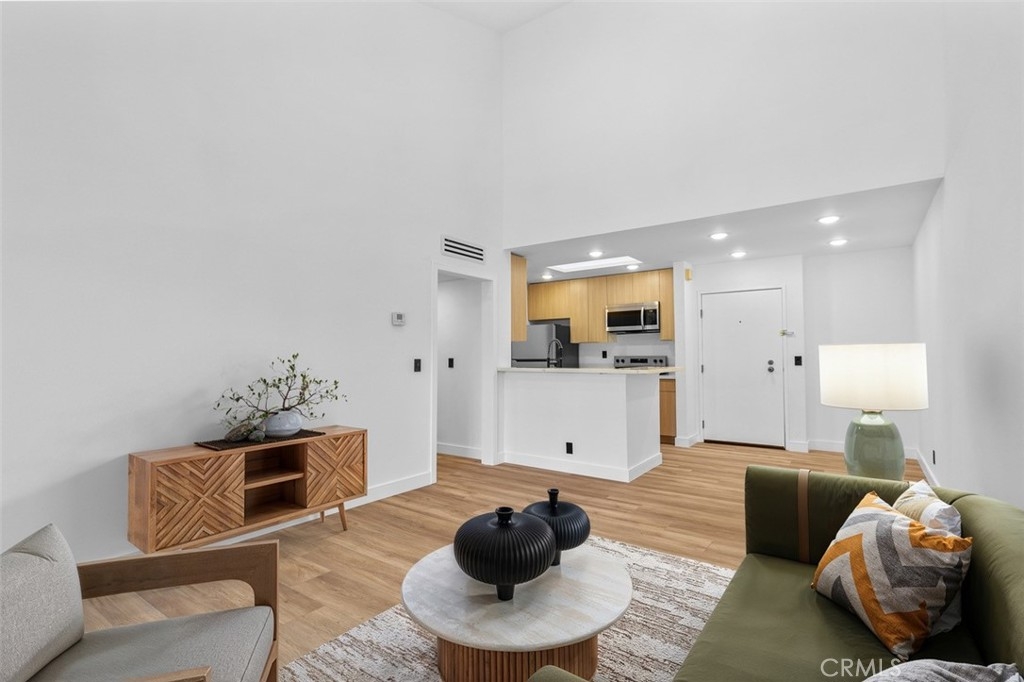 This beautifully remodeled top-floor one-bedroom condominium is nestled in the prestigious Catalina Terrace complex of Monterey Hills, minutes away to LA downtown or Pasadena easy access to 110 Freeway. Highlights include a spacious living room with a sliding glass door leading to a private balcony overlooking the tranquil lush garden and pool area, recessed lighting all over and a modern kitchen with stainless steel appliances and Quarts counters. The master bedroom boasts tall sliding mirrored closets and serene garden and pool views. Additional features include cathedral ceilings in the living room and master bedroom, a kitchen skylight, a generously sized balcony perfect for outdoor seating, central A/C and heating, secured entry, and gated underground parking with two side-by-side spaces. All remodeling including flooring & recessed lights are approved by HOA.