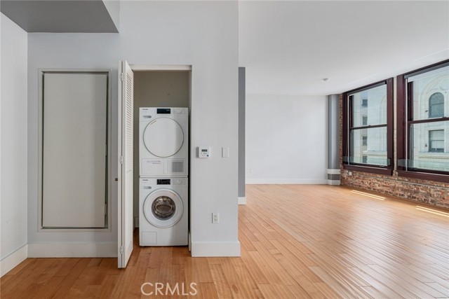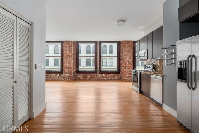 Live the best of DTLA life in this sleek 2-bathroom loft on Spring Street in the iconic Rowan building. This cool loft is one of the few units in the building to have an oversized 2-bedroom floorplan, on tax records, (which is currently set up as one big open loft space with one separated bedroom). The layout is such that the bedroom has been sectioned off as a separate room. It also features 10-foot ceilings, exposed brick walls, top of the line appliances and overlooks 5th Street. The large windows let in luscious amounts of light. The sleek kitchen is open to the living room. There’s a roomy bathroom with shower/tub combo en-suite with the private laundry area. Located in the Old Bank District in the booming Historic Core of Downtown LA, the Rowan was originally built in 1912 and exquisitely remodeled in 2008. Today’s residents enjoy a beautiful mix of historic building features and high-end modern conveniences. Historic features include exposed brick walls, original large windows with beautiful mahogany frames, historic marble flooring in the lobby and restored exterior façade. The Rowan is a full amenity building, including a 24-hour doorman, resident’s lounge, hot and cold plunge pools, outdoor BBQ area, dog run, on-site dry-cleaning valet and bike storage. All common areas are even WIFI-enabled. Parking is available to rent in the adjacent Old Bank District Garage, which is located directly behind the Rowan, and accessed via a partially gated alley.