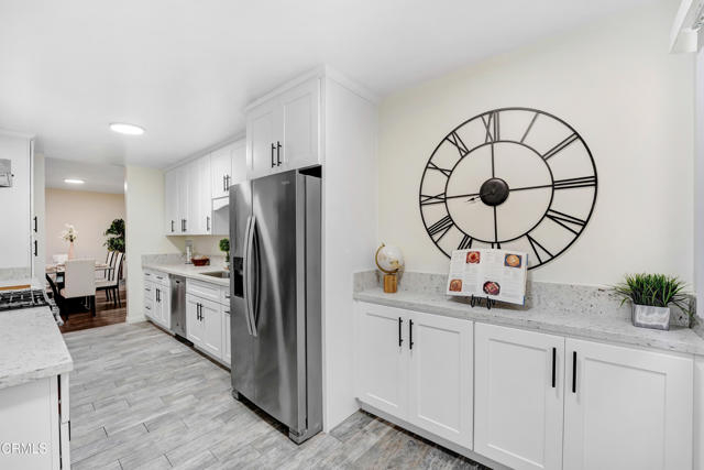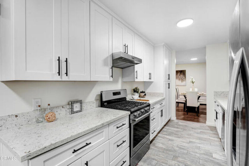 Nestled in the heart of North Hollywood, this beautifully updated first-floor 3-bedroom, 2-bathroom condo offers a bright, modern living space with generous room to relax, entertain, and enjoy community amenities. The expansive living room welcomes you with recessed lighting, warm wood-style flooring, and an open layout that easily accommodates multiple seating areas. Large windows bring in natural light, highlighting the inviting atmosphere and seamless flow into the dining area. The remodeled galley kitchen is a standout, featuring crisp white shaker cabinetry, sleek quartz countertops, stainless steel appliances, and ample storage--perfect for home chefs who value both style and functionality. Convenience is unmatched with this unit's ideal location right next to the community laundry room, making daily routines effortless. The home's spacious primary bedroom offers a peaceful retreat with room for a sitting area or workspace, while the additional bedrooms provide flexibility for guests, family, or office needs. Both bathrooms have been tastefully updated with modern vanities, elegant fixtures, and clean finishes. Step outside and enjoy one of the community's best features--the sparkling pool is located just steps from your door, creating a resort-like experience right at home. Lush landscaping and inviting outdoor seating areas complete the setting, offering plenty of space to unwind and soak up the California sun. With thoughtful updates, a highly desirable first-floor location, and easy access to the energy of the NoHo Arts District, this condo perfectly blends comfort, convenience, and contemporary style into a move-in-ready North Hollywood gem.