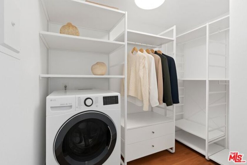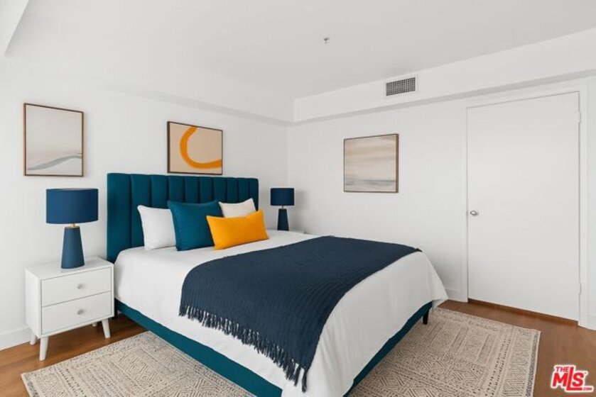 Classy and Fully updated sleek Condo in Hollywood! Perfectly located in the heart of Hollywood/Sunset Strip at the Hollywood Regis building, this FULLY RENOVATED JNR/1BA home is fully equipped for easy and comfortable living. Step inside to find an open floor plan with premium finishes, fabulous natural light, stunning hardwood floors, a designer color scheme, and a spacious living room. Entertain guests and mix drinks in the open concept kitchen featuring quartz countertops, stainless-steel appliances, dishwasher, sleek ample white cabinetry, gas cook-top, built-in microwave, track lighting, and an adjacent dining room with double glass soundproof sliding glass doors to the spacious balcony. Sit on the balcony and sip cocktails with friends while admiring the fabulous views of downtown Los Angeles. Discover relaxing evenings in the NYC loft style bedroom, which has a large walk-in closet with your own washer and dryer, Separate bathroom w/storage vanity and a shower/tub combo and separate vanity area. For a fit lifestyle, enjoy the community amenities of a sparkling heated swimming pool, hot tub, sun deck w/cabanas, and a fitness ceneter! Other features: 1-covered and secured parking space, onsite management, security fob on all entries, close to Runyon Canyon, shopping, chic restaurants, the Hollywood Bowl and more! Easy living LA style, the perfect pied- a -terre, first home or LA city pad, this little gem is a must see!